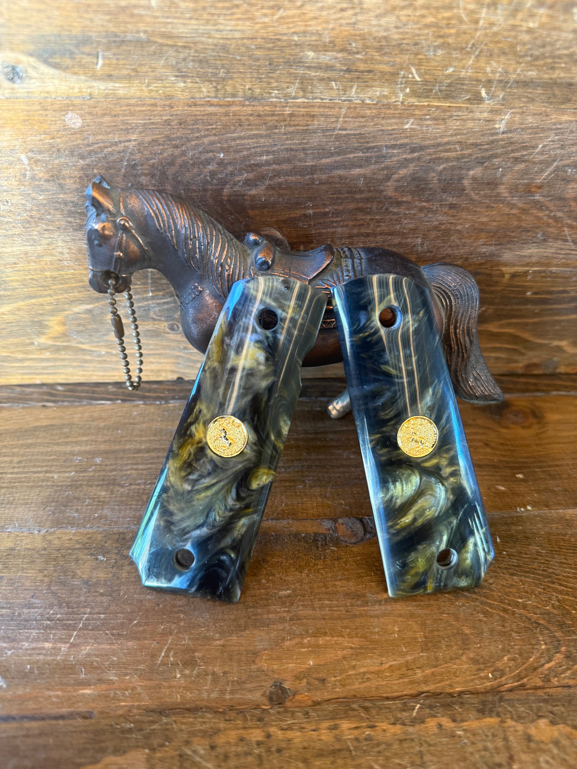 Cachas negras y oro con logo colt. Para modelos 1911. Modelos government y commando.