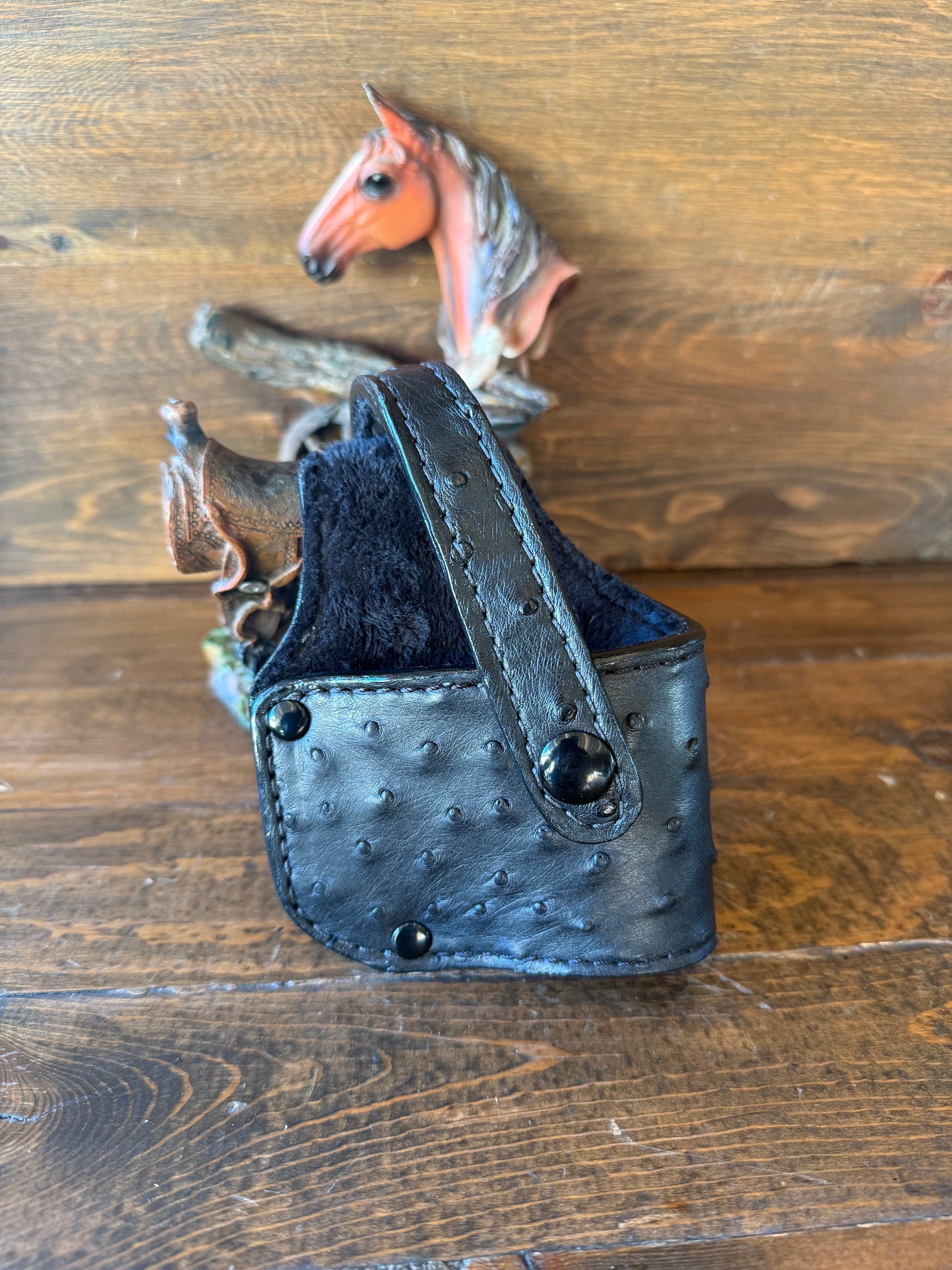 # H-182-3. Black ostrich luxury compact holster. With Black snap and rivets. Fits most of 1911 models. Soft velvet interior to prevent scratches. More colors available