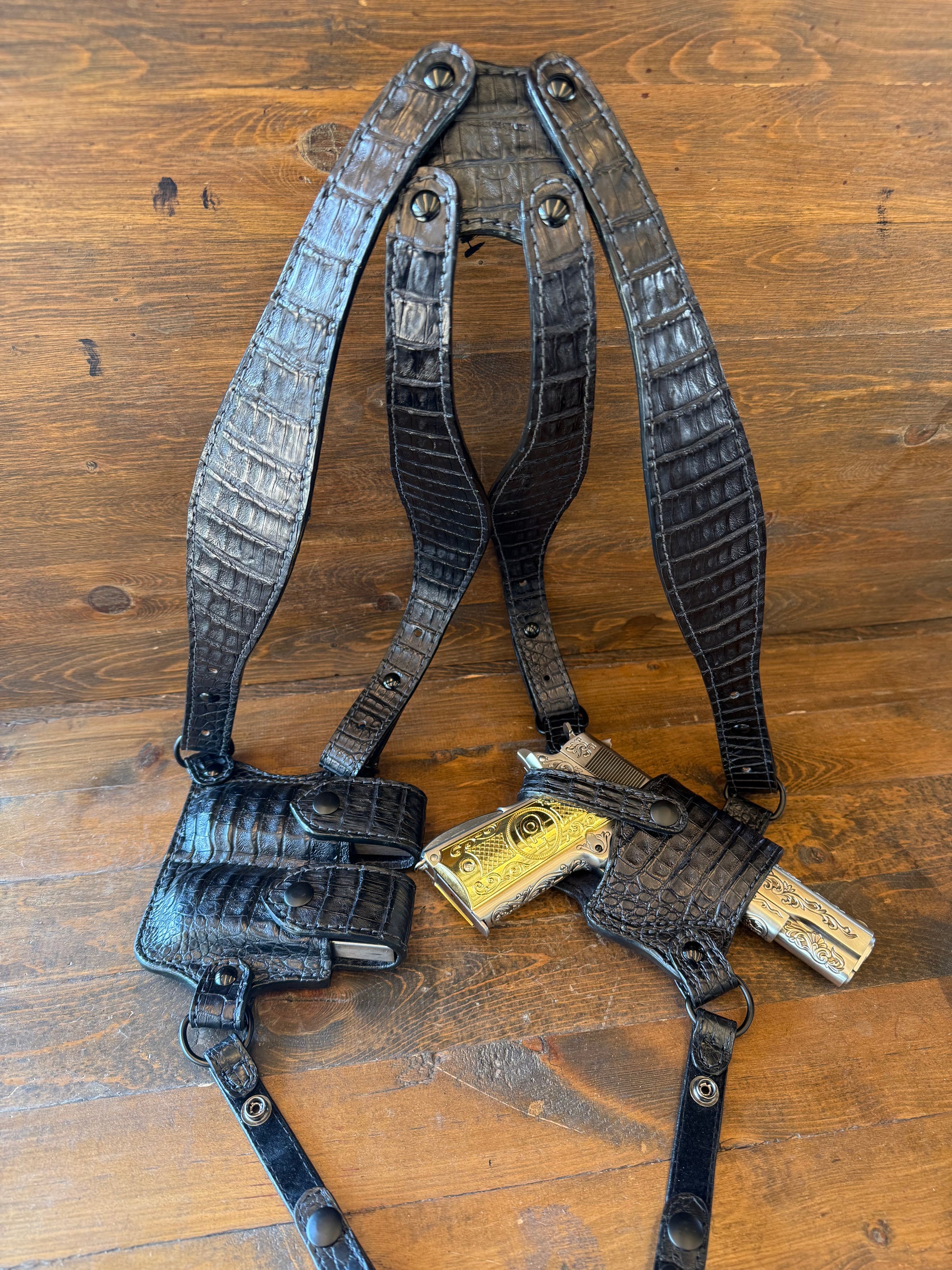 # S-102. Black crocodile/caiman belly luxury shoulder strap holsters . Fits most of 1911 models. And 2 Magazines. Luxury velvet interior to prevent scratches. Back is straps lined with suede. Fully adjustable with Chicago screws. More colors and skins available by order.