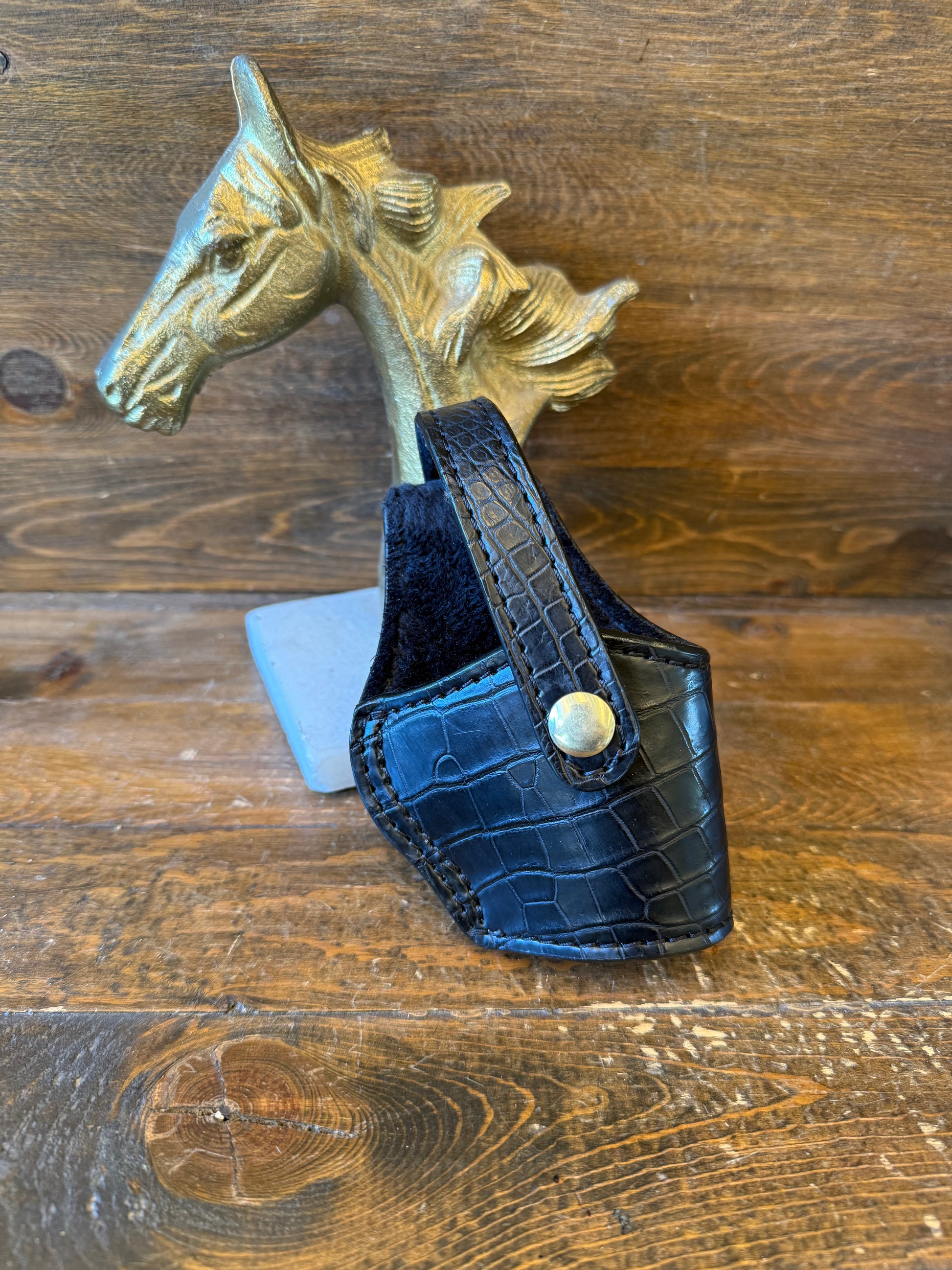 # H -148-2 Black alligator/crocodile belly skin compact holster. Gold color snap button Fits most of 1911 models. Soft velvet interior to prevent scratches.