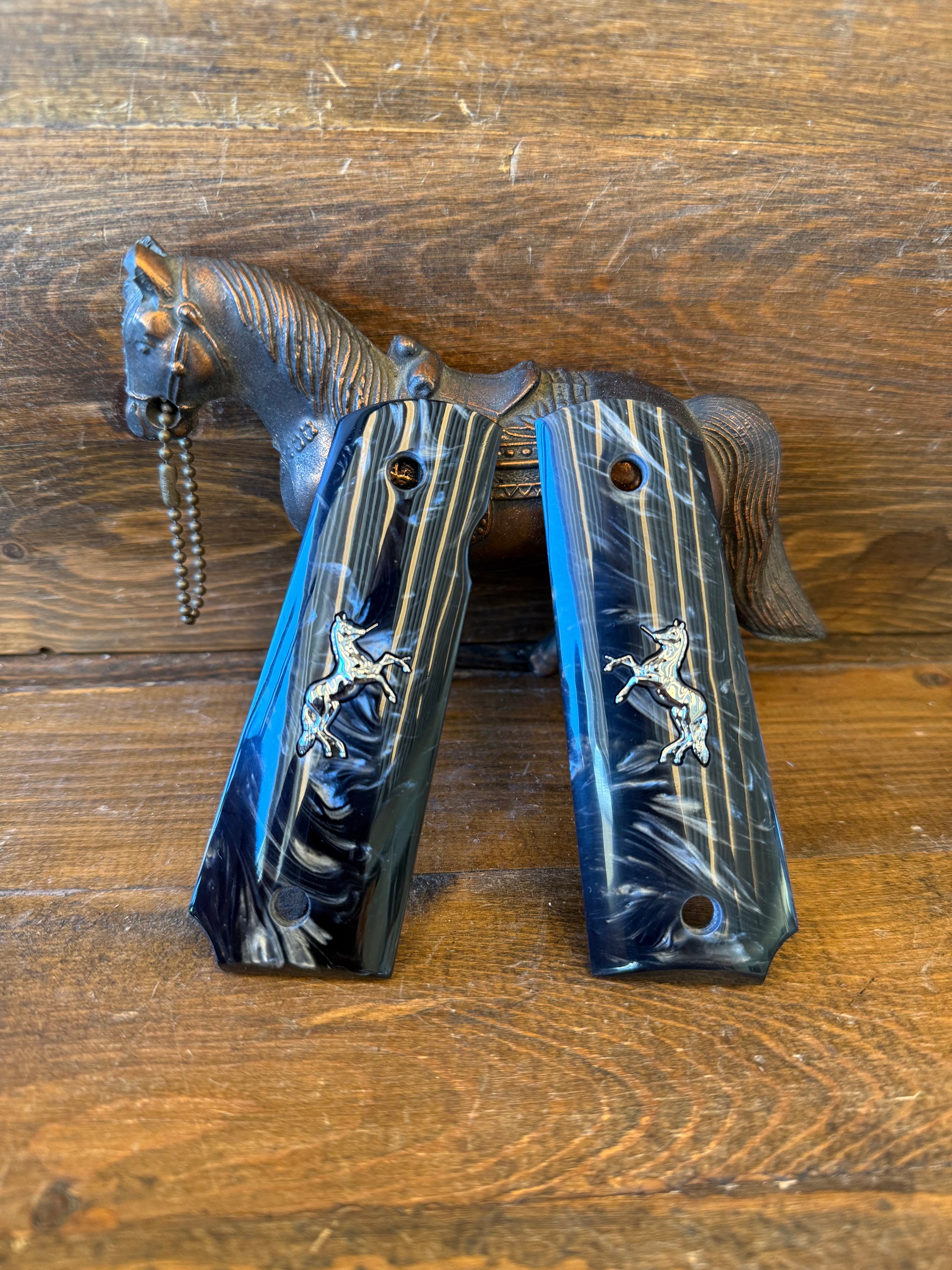 Cachas color Negro Perla con caballo color Plata . Para modelos 1911. Modelos government y commando.