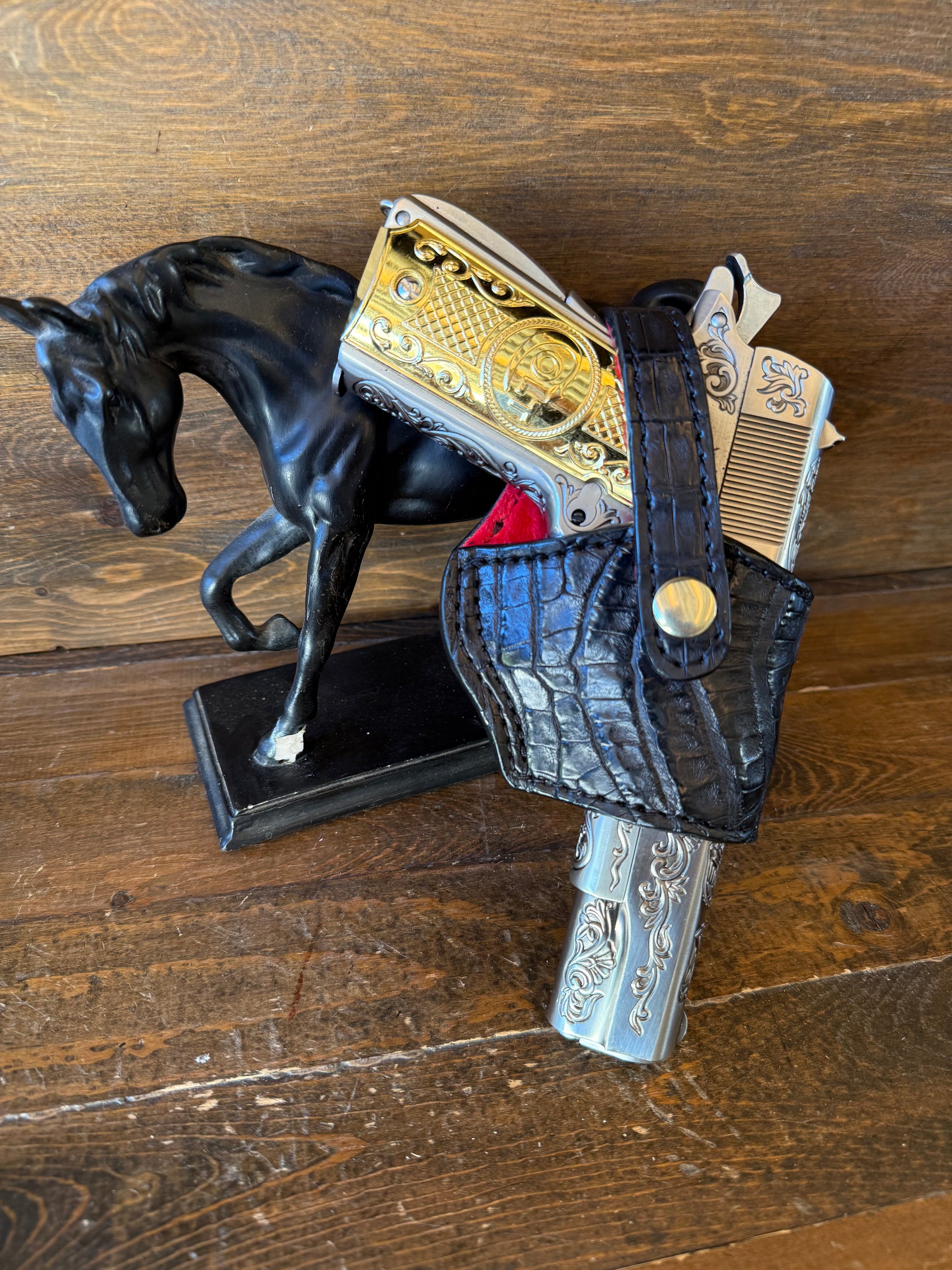 # H-163-2 . Black Crocodile/caiman belly skin luxury black/red compact holster. Gold color snap button. Fits most of 1911 models. Luxury red velvet interior to prevent scratches. More colors available by order.
