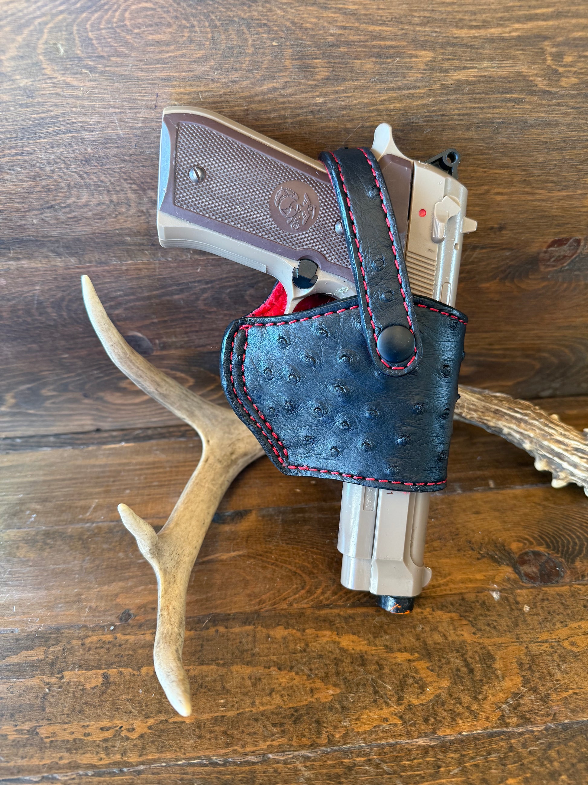 # H-255. Ostrich skin luxury black/red compact holster. For Beretta 92 models. Luxury Red velvet interior to prevent scratches. More colors available by order.