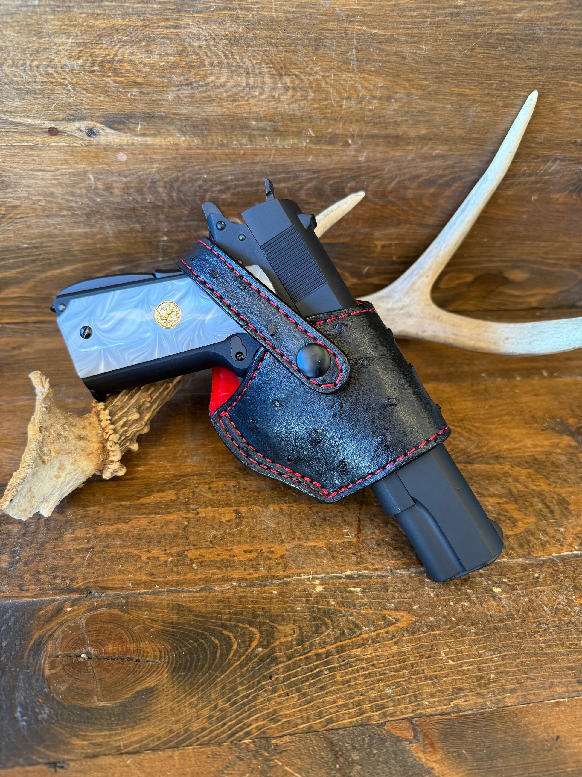 # H-333 Black/red Ostrich skin luxury compact holster W/clip Fits most of 1911 models. Luxury red velvet interior to prevent scratches. More colors available by order.
