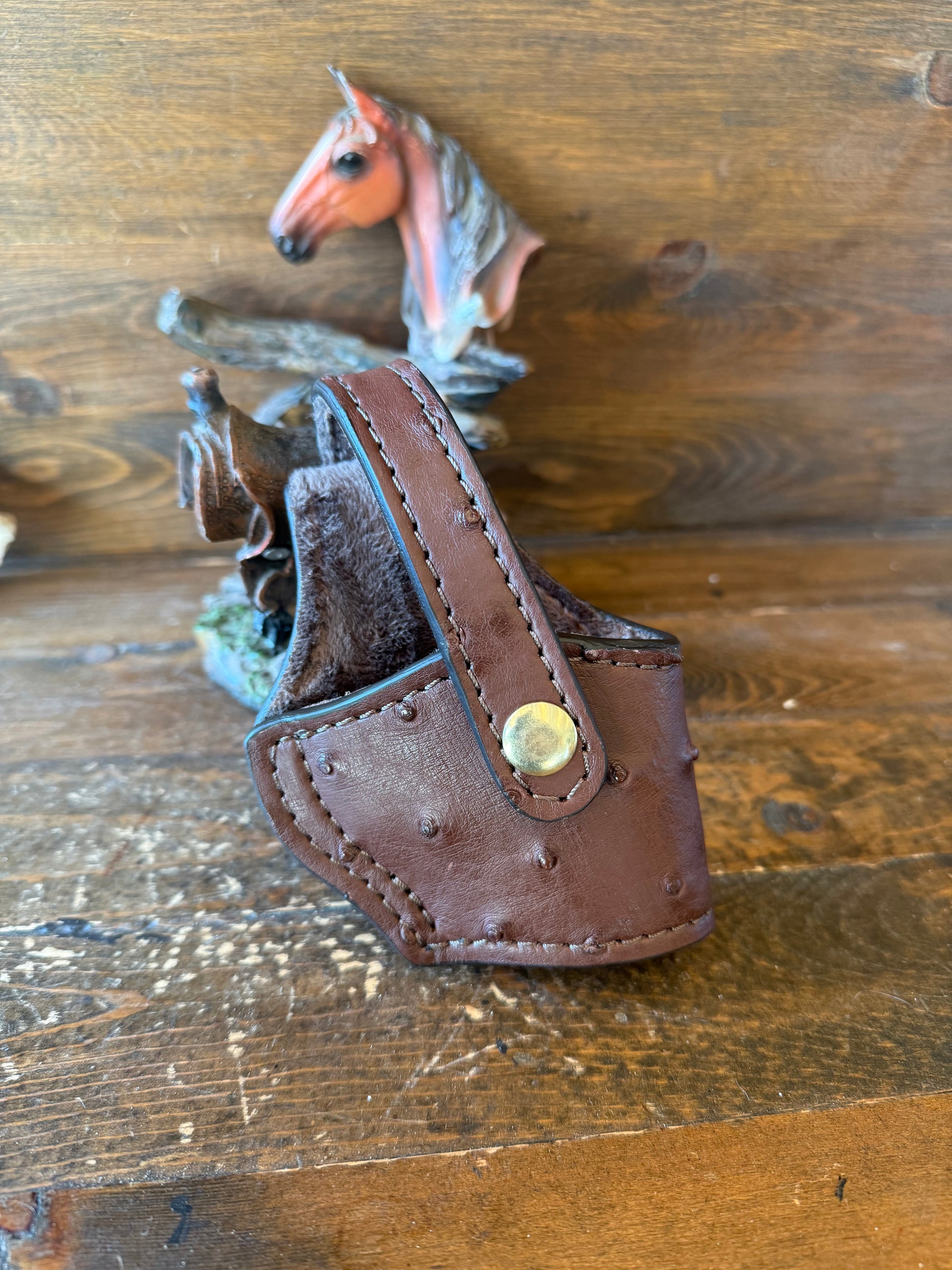 # H-234-2 Brown/gold ostrich skin luxury compact holster. Fits most of 1911 models. Gold color snap button. Soft velvet interior to prevent scratches . More colors available by order.