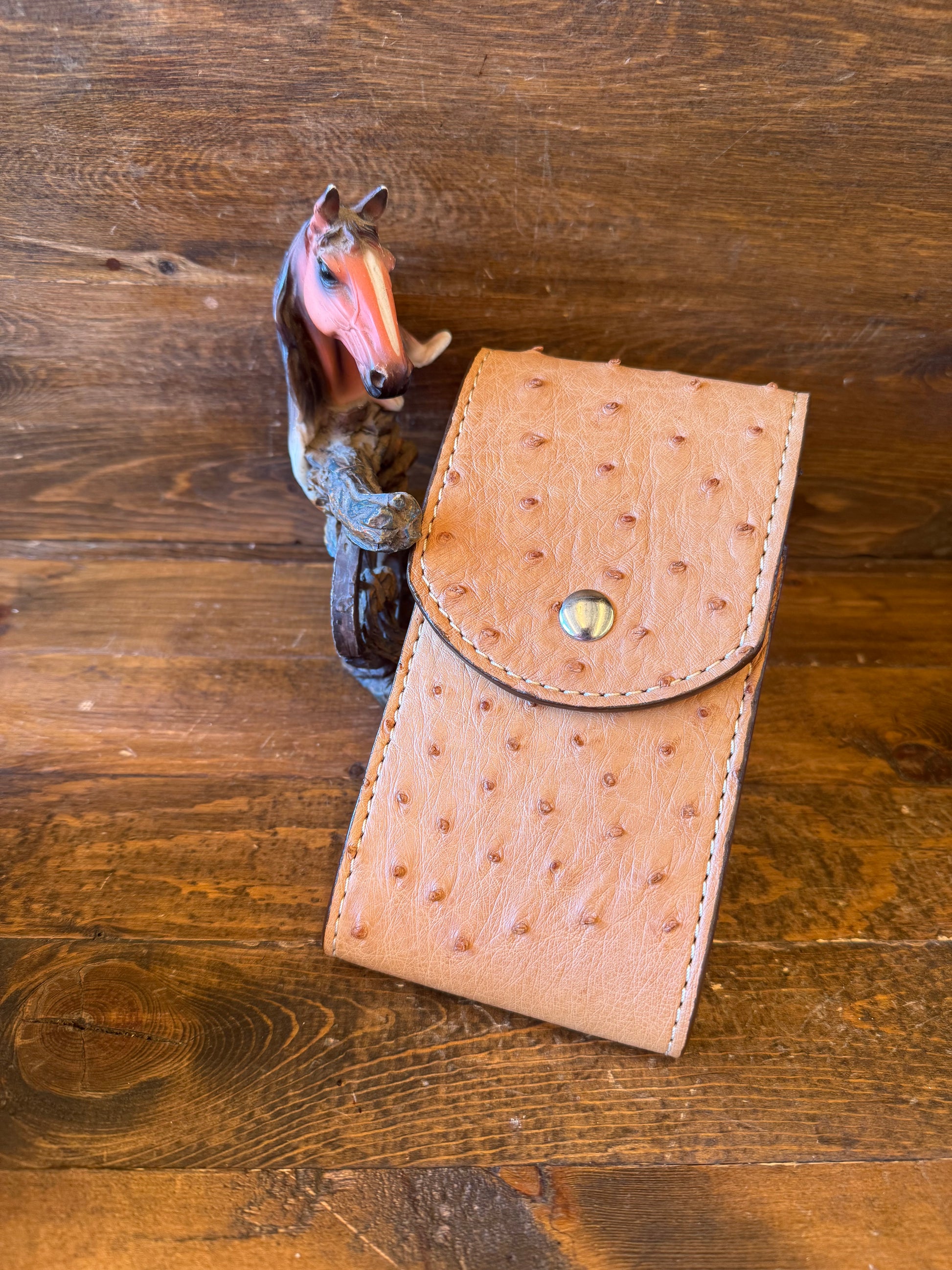 # CH- 106. Honey color ostrich skin cellphone holster. Veg-tan leather interior. More colors available. Contact for request