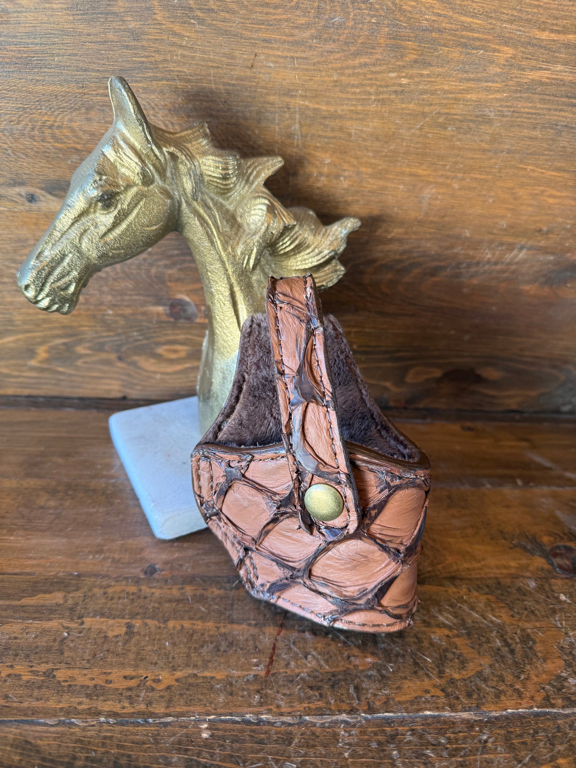 # H-213 Brown Pirarucu fish skin compact holsters. Copper color snap. Fits most of 1911 models. Soft velvet interior to prevent scratching. More colors available by order.