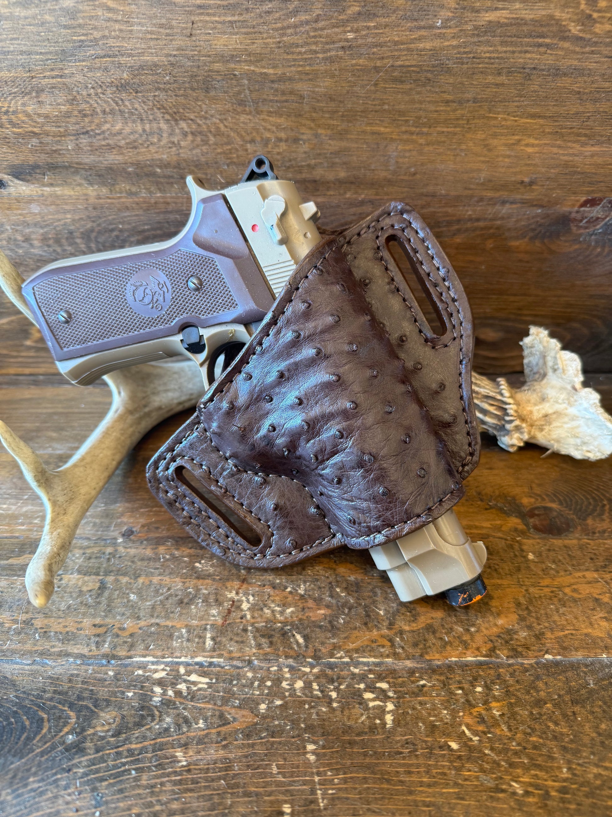 H-159. Dark brown ostrich skin Luxury holster. Fits Beretta 9mm models . Soft velvet inteior to prevent scratches. More colors available by order.