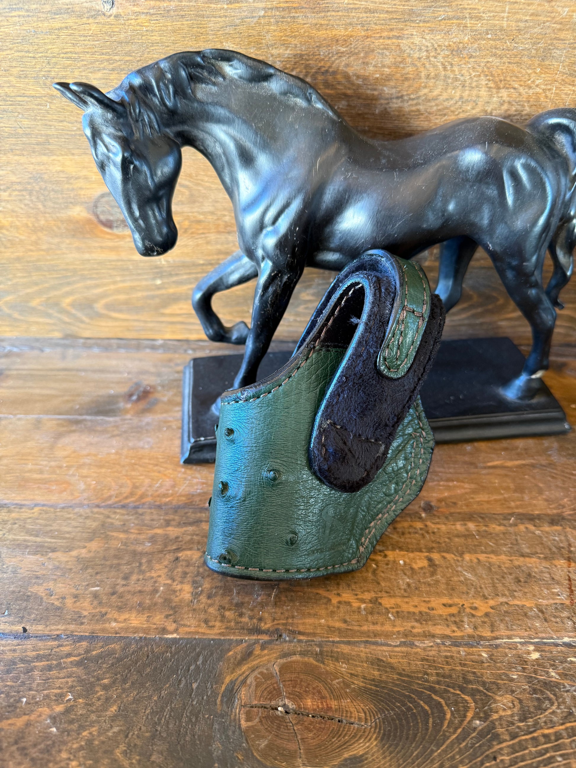 # H-214-2 Dark green ostrich skin compact holster. Chrome snap button. Fits most of 1911 models. Soft velvet interior to prevent scratches. More colors available by order.