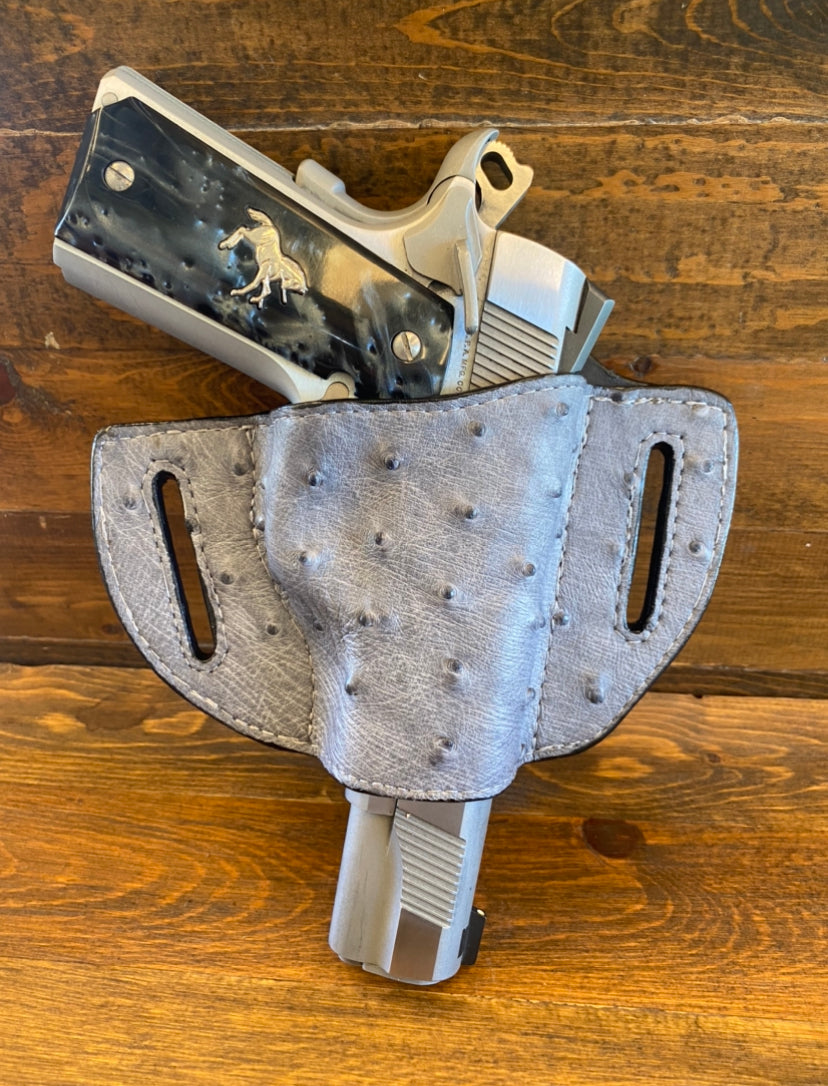 # H-128. Gray ostrich holster, fits. Most of 1911 models. veg-tan inteior. More colors available if requested by order