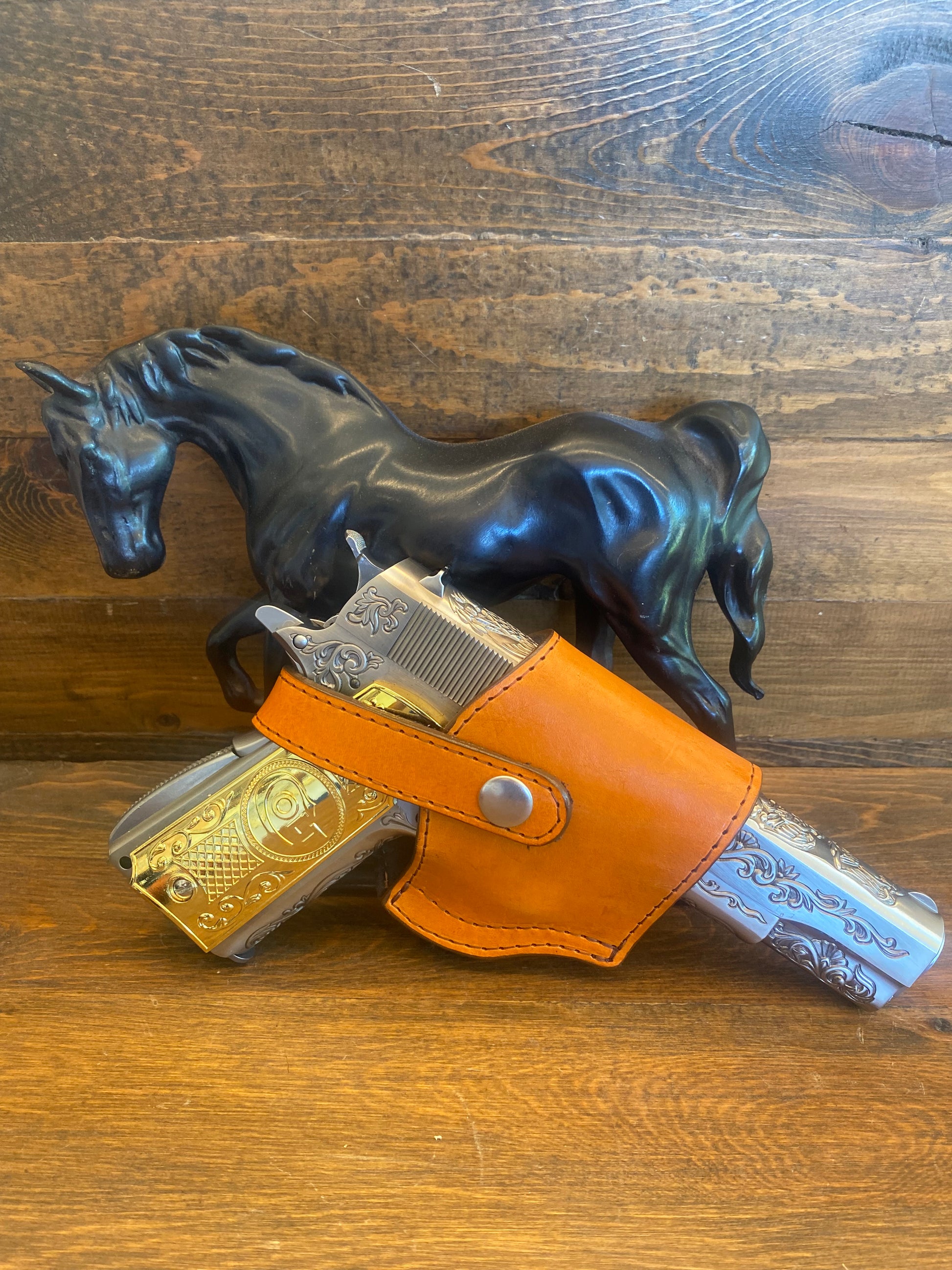 # H-144. Range tan veg leather compact holster. Fits most of 1911 models. Soft velvet interior to prevent scratches. More colors available.