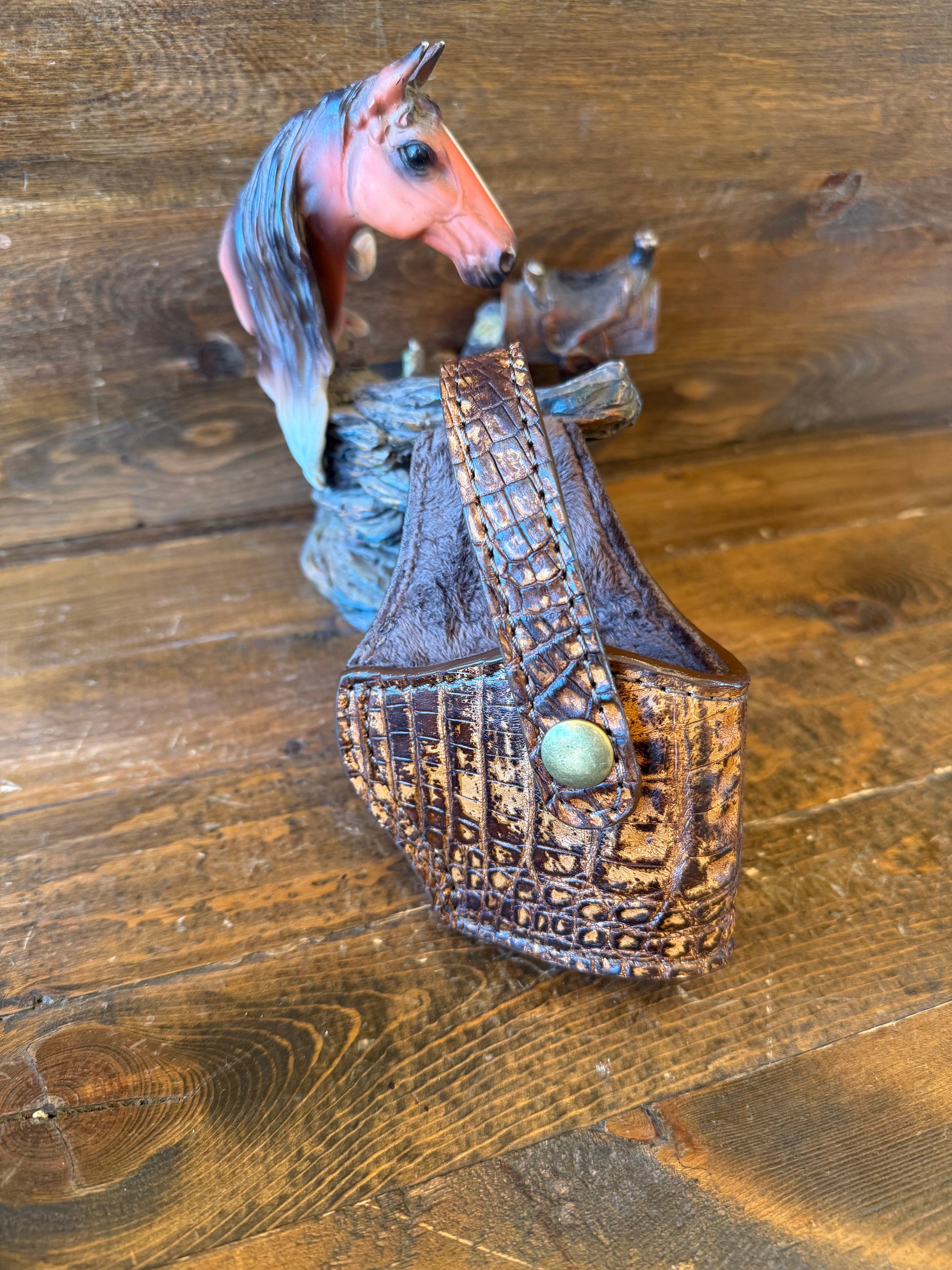 # H-215 Rustic brown crocodile/caiman skin compact holster. W/Gold color snap fastener. Fits most of 1911 models. Soft velvet interior to prevent scratches. More colors available by order.